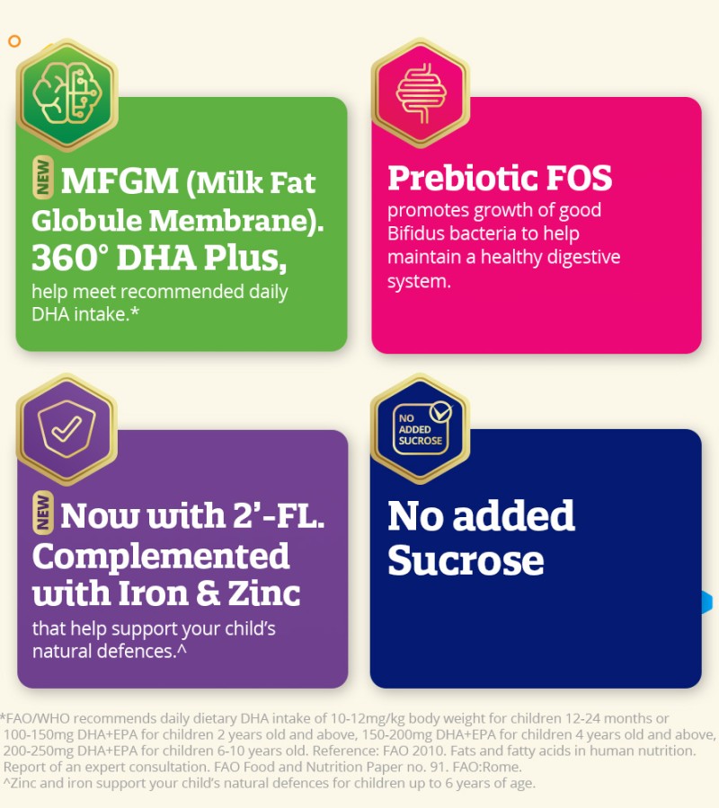 - Milk Fat Globule Membrane (MFGM) is a natural source of phospholipids and spingomyelin, derived from whey protein Formulated with 360’ DHA Plus to help meet recommended daily DHA intake*.