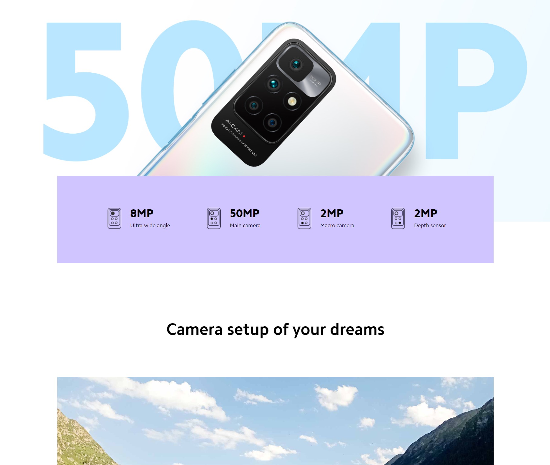 • 50MP AI quad rear camera · 50MP main camera f/1.8 · 8MP ultra-wide angle camera FOV 120° f/2.2 · 2MP macro camera f/2.4 · 2MP depth sensor f/2.4