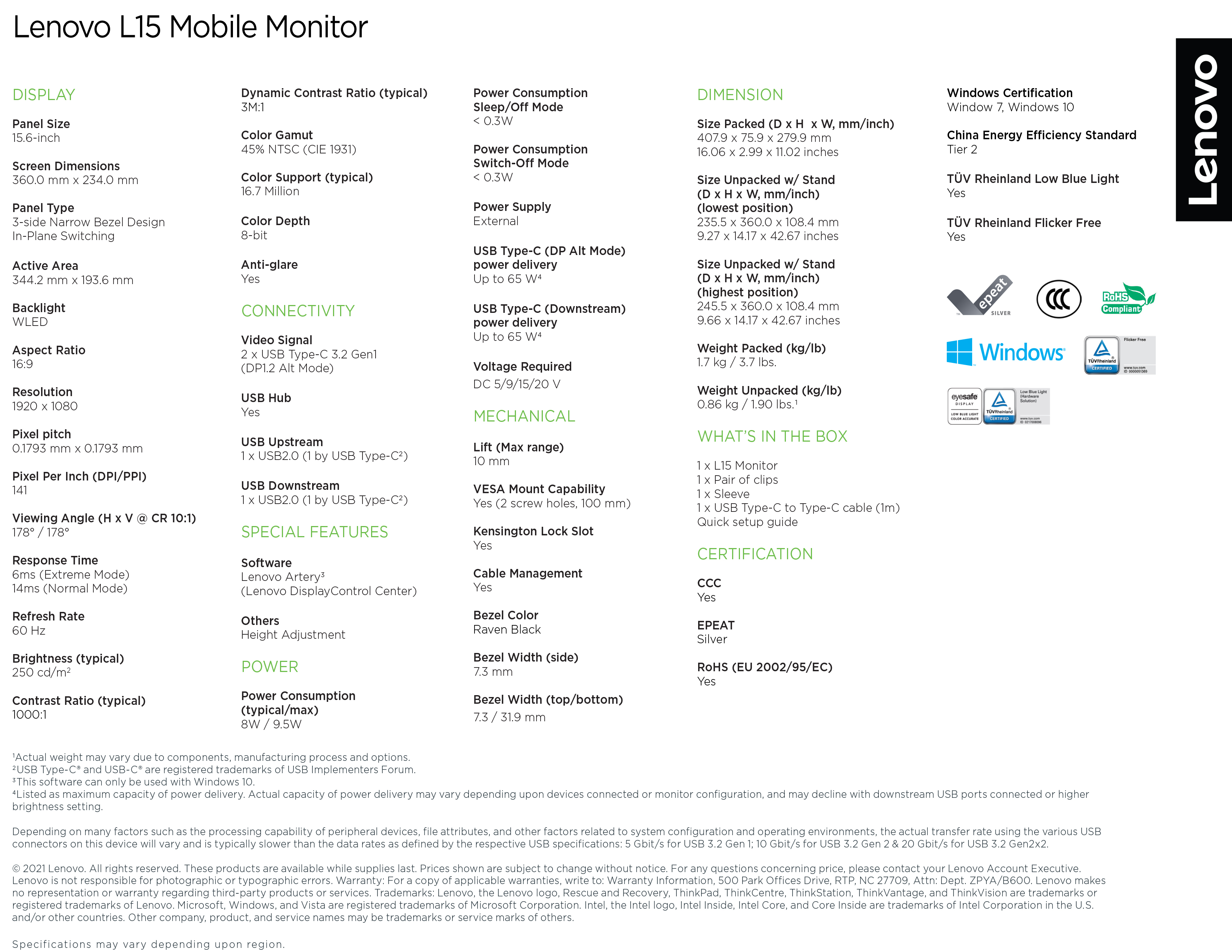 联想L15移动显示器|66E4UAC1WW|15.6英寸1920x1080 60赫兹|16:9 250尼特|141 dpi 45%NTSC |高度调节支架|3Y保修
